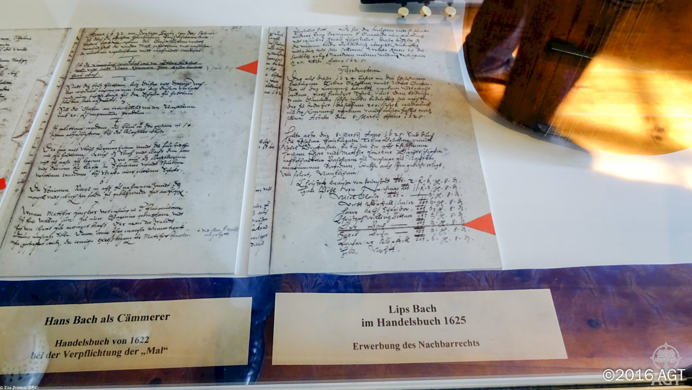 Das ehemalige obere Backhaus ist sicherlich das Highlight der Führung gewesen. Hier hat Veit Bach zusammen mit seinem Sohn Hans das Bäckerhandwerk ausgeübt und die ersten musikalischen Grundlagen gelegt. Zu Zeiten der DDR war es Fleischerei und heute beinhaltet es das Bach-Museum. Liebevoll eingerichtet erzählt es von Wechmar und seiner berühmten Musiker-Familie. Aber auch andere, etwas weniger berühmte Wechmarer kommen hier zur Geltung. Genannt sei hier beispielsweise die Instrumentenbauerfamilie Artmann oder der erste Wechmarer Heimatforscher und Lehrer Schlimbach. Auch erblickt man kleine Details zur eigenen Familiengeschichte. Ein Auszug aus dem Handelsbuch weist beispielsweise aus, dass mein Vorfahr Nicolaus Gräfenha(i)n am 8. März 1625 in seinem Amt als Wechmarer Heimbürger einem gewissen Lips Bach nach Zahlung der üblichen Gebühr das Nachbarrecht zuerkannte.